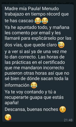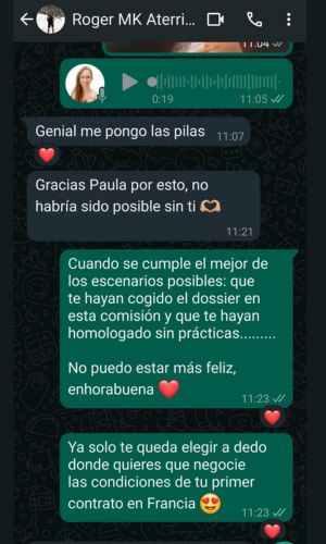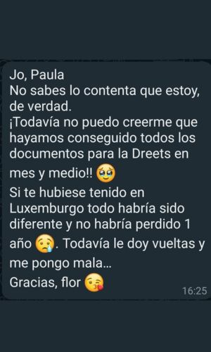 Ha sido gracias a Paula que ahora mismo me encuentro trabajando en Francia en un cabinet. Al inicio todo son dificultades por los papeles y los ritmos de las administraciones y, puedo decir con certeza, que sin su ayuda no habría imaginado avanzar tan rápido con el proceso y estar trabajando en Francia en tan poco tiempo.
